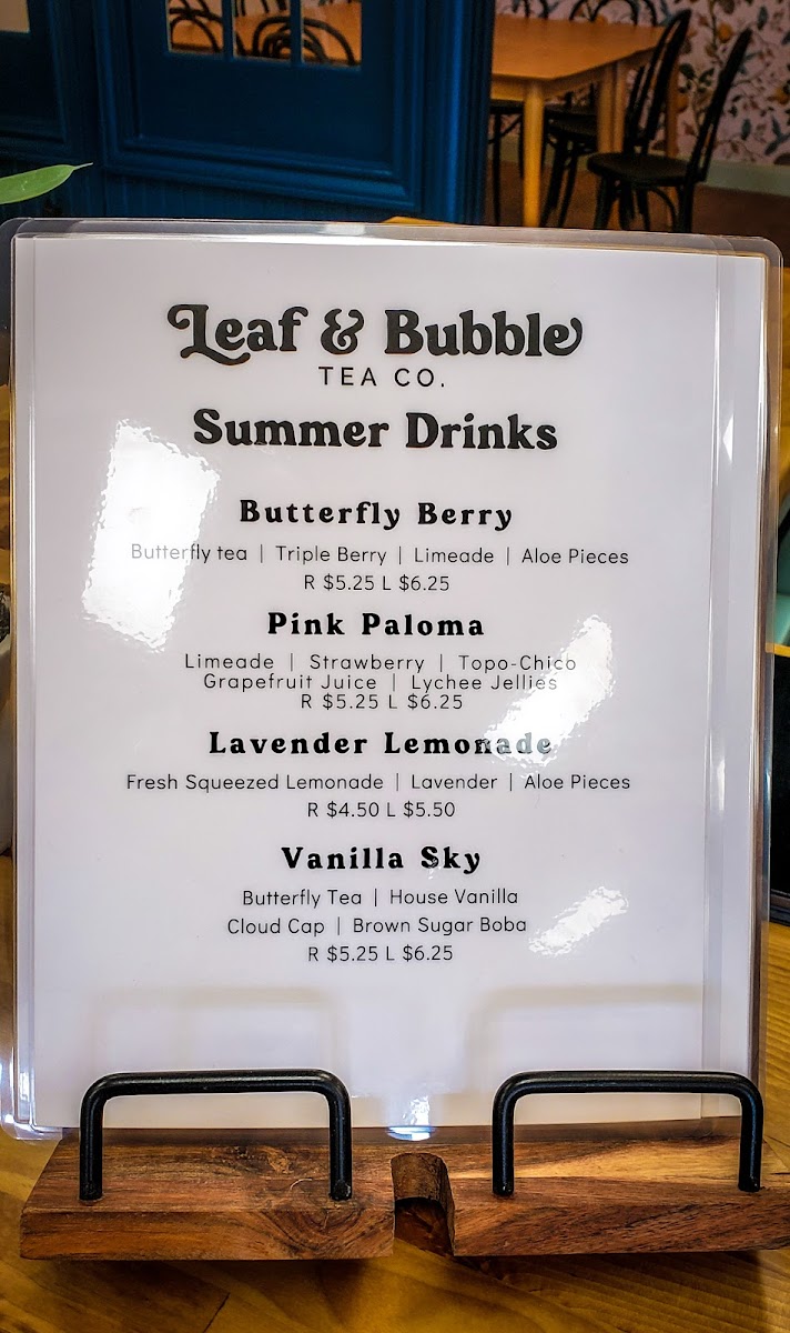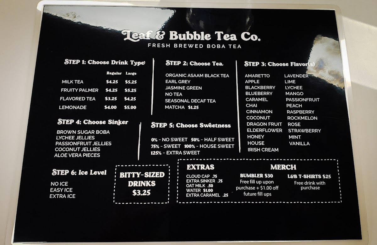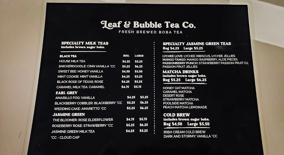 Leaf & Bubble Tea Co. offers an exciting and diverse menu, ideal for tea lovers and those with a sweet tooth. Their Milk Teas feature intriguing options such as the Almond Joy and Amarillo Fog, each with unique flavors priced around $5. For those seeking something fruity, their Matcha selection is just as inviting, including options like the Banana Grove and Mango Blossom, both offering rich and flavorful combinations. Coffee enthusiasts will love the Cold Brew section, with creations like Apple Crisp and Cinnamon Roll Cold Brew at about $4.75. The Acai Bowls are equally tantalizing, with choices like the Berry Bliss and Chocolate Dream bowls at $9.99, perfect for a healthy and satisfying treat. Sweet tooths are also catered to with delicious Baked Goods like Brookie and Cake Pops priced around $2 each. Smoothie lovers can indulge in options like the Groovy PB Smoothie or Pink Power Smoothie, both refreshing and wholesome. For those who enjoy customizing their drinks, Custom Cold Brew, Custom Matcha, and Custom Lemonade allow for personalized creations starting at $4.50. The Lemonade section offers vibrant options like Butterfly Berry and Fuzzy Dragon, priced at about $4. As for their Miscellaneous offerings, the Butter Beer Boba and Midnight Brew provide a fun twist, with unique flavors and a price tag of $4.50. With their wide array of beverages and treats, Leaf & Bubble Tea Co. provides something for everyone to enjoy, whether you're craving a sweet dessert or a refreshing drink.